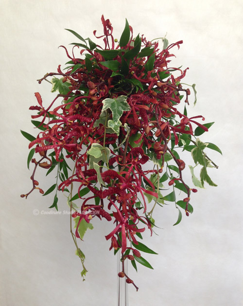 このブーケは、実際の婚礼ではなくて、資格取得のレッスンで受講生の方が練習に作ったものです。先日このブログでご紹介した「アランセラ アンブラック」という生花の蘭をメインに使っています。細い花びらが、シャープでモダンな雰囲気なので、他のお花は使わず、イタリアンルスカスとアイビーだけを合わせました。