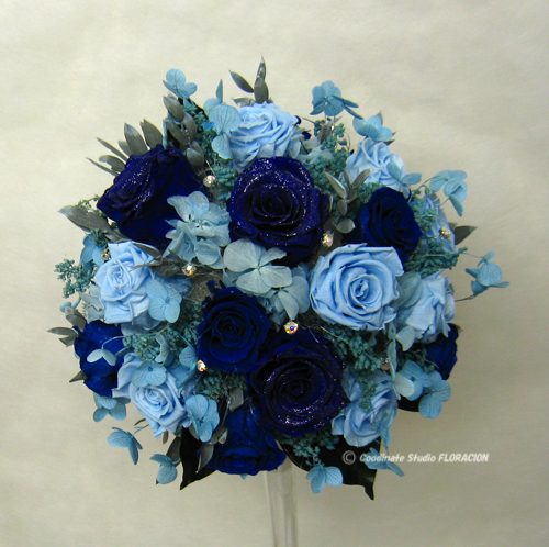 このブーケは、実際の挙式用に、花嫁さんのお母様が手作りされたものです。和装で挙式されたお嬢さんは、披露宴で 純白のウエディングドレスにお色直しされました。深いブルーにダイヤモンドラメを 散りばめたゴージャスなバラをメインに 水色のバラやノリウツギ ユーカリなどを合わせています。 フェイクダイヤでキラキラにして クールビューティーなイメージに 仕上げました。サムシングブルーの おまじないにもなりますね。