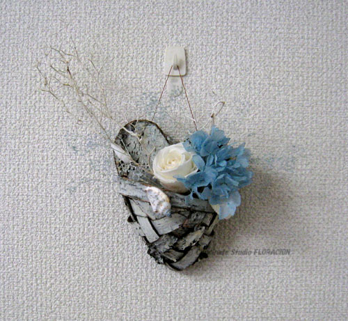 青と白を合わせた配色は、夏の定番ですが、意外と冬らしい作品にも使えます。ドライの白樺で作られたフラワーベースが、そのままでも冬の風情を感じさせていますね。スキー場のロッジなど思わせるアイテムです。このハート型の壁飾りは、白樺に白いペインティングが施してあるので、樹の表面に雪が積もったようにも見えます。