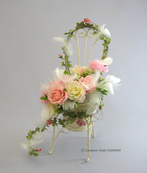 この写真は、造花で作った受講生の作品です。寒かった庭に、やっと春の天使が降りてきたような、乙女チックなアレンジメントになりました。パステルピンクのバラの中に、同じパステルトーンの黄色をプラスしたので、暖かな光を感じます。羽を一杯飾って、ロマンチックなガーデンチェアーに座っている気分に♪