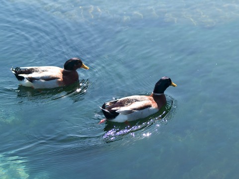 マガモは、「古事記」にも登場する鳥で、そんな時代から冬になると日本へ飛んできていたようです。この写真では、光の当たり方で、かなり暗く写っていますが、オスの鴨の頭の部分の、強い緑みの青を指して、「鴨の羽色(かものはいろ)」といいます。