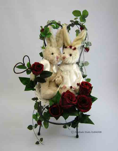 この画像は、イースターの作品ではありませんが、カップルのウサギが可愛いのでご覧ください。受講生の方の、大切な思い出の品なのですが、まわりを飾っていた造花が汚れてきたので、プリザーブドフラワーでリメイクされました。元の造花が、赤かったので、イメージをあまり変えないように、赤いバラを使いました。女の子のドレスと髪飾りが、赤とピンクなので、よく似合いますね。男の子が、ハートの花束を渡しているところです♪