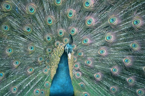 この羽は、シャボン玉などのキラキラと同じ光の干渉現象によって、青や緑に変化して見えます。それで、「ピーコック・ブルー」と「ピーコック・グリーン」という2つの色名が出来ました。ヒンズー教では、聖なる鳥とされていますが、英語のピーコックには、「虚栄家」なんて意味もありますよ。