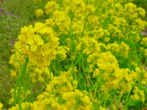 古代から世界中で栽培されていたらしいのですが、日本でも平安時代以前から咲いていたらしく、江戸時代に灯油を採るために栽培されていたことは有名です。厳密には切花用とは品種が違うのですが、一般的に菜の花は、アブラナといわれたり、菜種ともいわれたりしています。慣用色名としては、菜の花色と菜種色は同じ色で、少し緑がかった黄色の事を指します。菜種色は油の色という説もありますが、菜種油色とか油色という色名があるので、お花の色だと書いてある書籍が多いです。