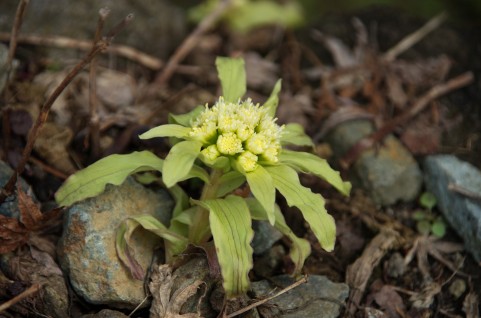 蕗は、花というより、野菜の印象が強い植物ですね。そして、この花が咲く前に、土の中から顔をのぞかせるのが、あの天ぷらにすると美味しいフキノトウですよ。春一番の山菜として有名です。それなので、蕗は、お花が一番知られていないのかもしれません。このような白っぽい黄色をしています。ちょっと地味ですが、覚えてあげてください。