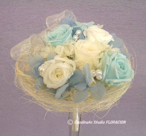 そこで、登場したのが、ブーケトスのためだけに作られた、代理のブーケです。挙式で持ったブーケになるべく似せて、軽くて投げやすくしたトス用ブーケは、ホテルや結婚式場、お花屋さんでも作ってもらうことが出来ます。この写真は、お友達の結婚式に出席された受講生の方が、プリザーブドフラワーで作ってプレゼントされた手作りのトス用ブーケです。スポンジのついたブーケホルダーを使わずに、ワイヤーで小さく軽く投げやすいように仕上げています。このブーケは、挙式当日無事投げられたのですが、なんとプレゼントした人の小学生のお嬢さんが受け取ってしまって、すぐに返ってきたそうですw次の花嫁さんになるには若すぎる・・・。