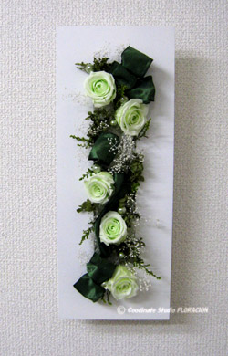 でも、せっかく手作りするんだったら、個々のお好みにも合わせたいものです。そこで、事前にさり気なく好きな色を聞き出しておいて、色違いの贈呈品を贈るというアイデアはいかがでしょうか?この2つのフレームアレンジメントは、実際の披露宴で贈呈されたものです。左はピンクの好きな新郎のお母様へ、右はグリーンの好きな新婦のお母様へプレゼントされました。