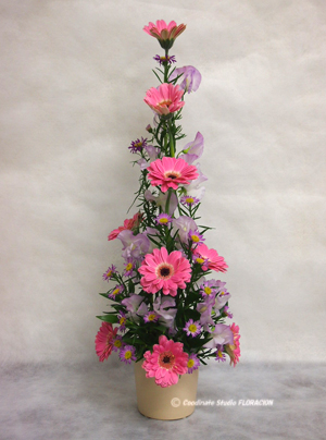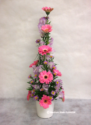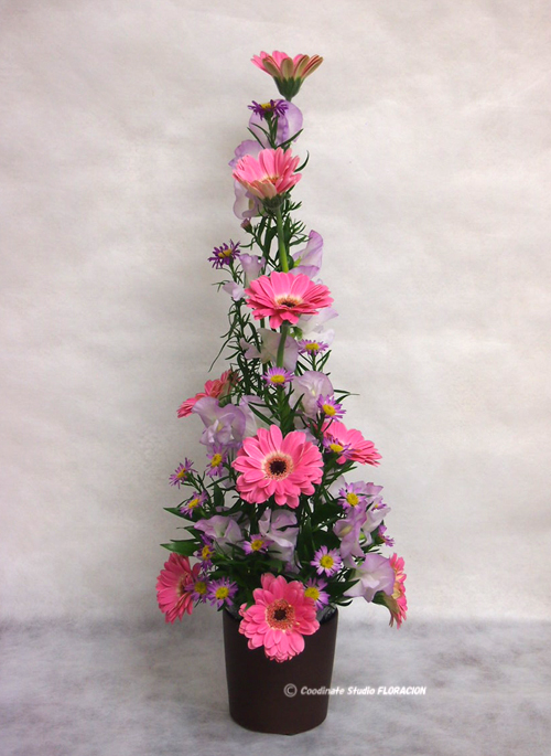 花器を使うフラワーアレンジメントでは、そのデザインも重要な要素になります。同じ形の花器でも、色が違うだけで、ずいぶん作品のイメージが変わってきます。オーソドックスな形の花器に、ヴァーティカルというフレッシュフラワーの基本形を活けて、比べてみました。まず、茶色ですが、秋らしく落ち着いたムードに仕上がります。