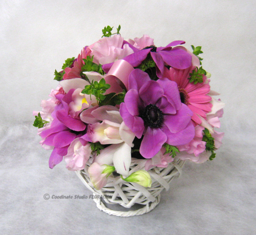 細かく色数を数えれば、多色使いになりますが、ガーベラ、スイトピー、シンビジウム、そしてリボンがピンクなので、おおらかに考えれば、ピンクとアネモネの紫を合わせた類似色相配色になっています。白い花器が、明るい春を思わせてくれますね。
