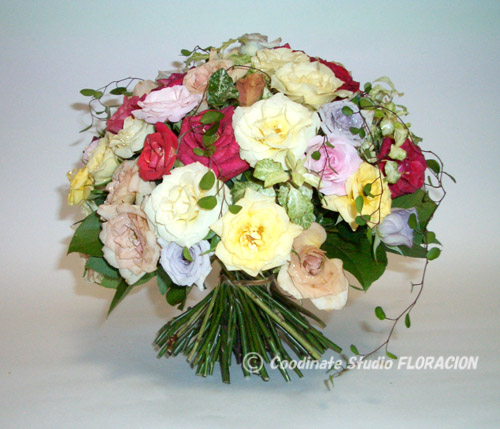 今日ご紹介するのは、フレッシュフラワーの色とりどりのバラを集めたブーケです。バラ以外は、葉物のみ使用しました(ピットスポラム、ワイヤープランツ、レモンリーフ)。同じ種類のお花ばかりを合わせる、花色ハーモニーメソッドのドミナントフラワーで、ナチュラルステムのブーケを作ってみました。このようなスパイラルに束ねるテクニックは、反復練習が必要ですが、色々なバラを花瓶に投げ入れるだけでも、結構サマになりますよ。
