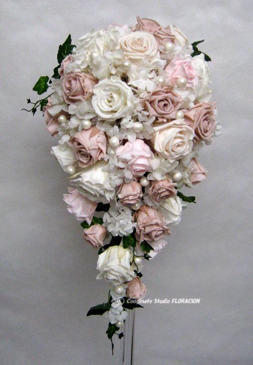 このブーケは、まず2色の異なる淡~いピンクを合わせています。プリザーブドフラワーのメーカーさんが名付けた色名ですが、「ヌードピンク」と「ピンクシャンペーン」という色のバラを使いました。白いブーケが、ほんのりピンクに見える感じを目指したので、「パールホワイト」という純白のバラと「パンナコッタ」という名の、少し黄色っぽいようなオレンジっぽいような白を合わせています。お菓子のパンナコッタの色ですよ。