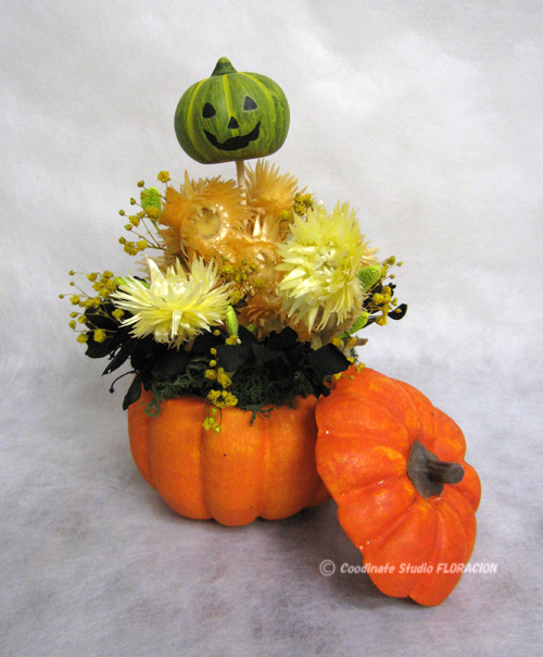顔つきのカボチャ君は、定番のオレンジ色ではなく、花器の色を引き立てるグリーンにしています。花器のカボチャが、一目見て「あっ!カボチャ!」って感じるアイキャッチの役割をしています。こんなリアルな器が見つかったら、本物をカットするよりいいと思います・・・。