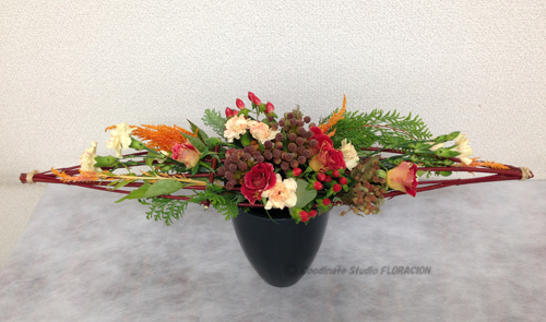 サンゴミズキのワインレッドに合わせて、落ち着いたトーンの赤バラと、クリスマスの定番花材、小ヒバとバーゼリアを合わせると、少し暗い配色になるので、クリスマスカラーではありませんが、オレンジ系の花材をプラスしてみました。キャンドルのようなオレンジ色のケイトウと、淡いオレンジ色のスプレーカーネーション、ピペリカムも少しオレンジ寄りの赤を使っています。