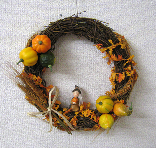 どちらかというと、置くタイプのフラワーデザインが人気のハロウィンですが、こんなリースはいかがでしょうか?ドライのサンキライバインのリース台は、素朴なイメージなので、パンプキンのオレンジ系の色によく似合います。あまり宗教色のない日本のハロウィンには、秋の風物詩的な要素が強いので、ドライフラワーの麦など合わせて、収穫を感じさせるのもいいでしょう。