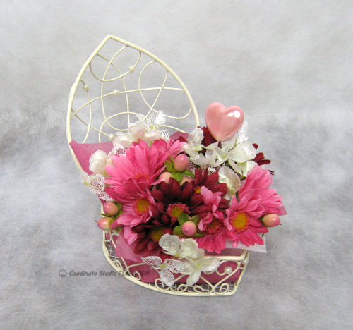 【花色】ハートのワイヤーバスケットと花材の色彩
