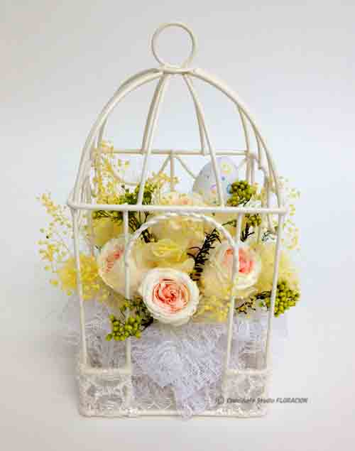 プリザーブドフラワーに魅せられた受講生の作品です。イースターの象徴が卵なので、鳥かごのデザインもオススメです。イースターの場合、テーマカラーが黄色なので、カジュアルになりがちですが、淡~い黄色のアジサイやカスミソウで、フワフワした感じを出しました。カゴの下部のレエスを、さらに強調するように、レエスのリボンをたっぷりプラスして、甘いイメージに!スポンジを隠す役目もしています。