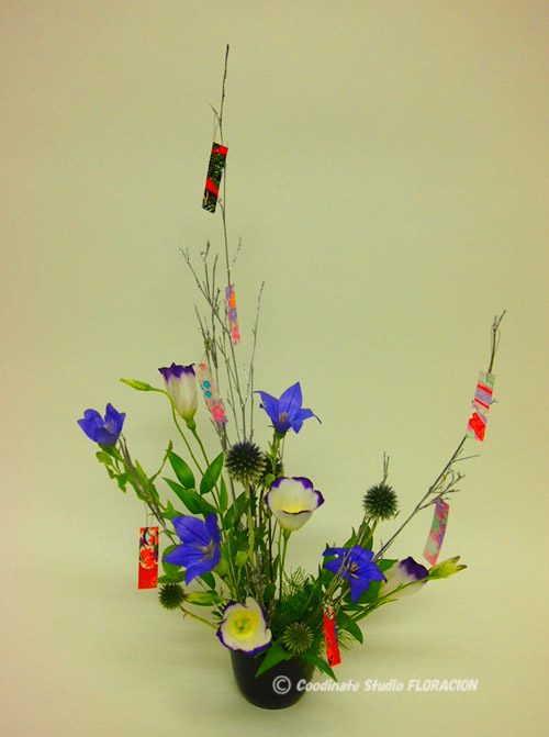 桔梗、トルコギキョウ、ルリタマアザミは夜空、シルバーに着色したドライの枝物は、銀河のイメージです。そこへ、和柄の色紙を短冊型にカットして、ゴールドワイヤーで吊るしました。もちろん、フレッシュの笹を使ってもいいのですが、すぐに葉が巻き込んで日持ちが悪いので、取り扱い注意です。笹なら、造花がオススメですよ。では今宵、星に願いを!ステキな七夕をお過ごしください。