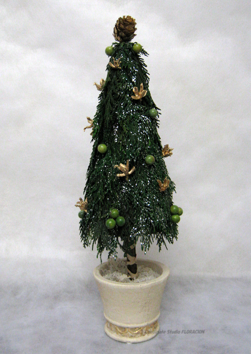 少しアンティークな花器に、三角のトピアリーを作りました。フラワーアレンジメントのトピアリーは、上部が丸いデザインが多いのですが、三角にすれば、クリスマスにピッタリな形になります。コウンよりも、枝が見えるので、樹!ッていう感じも強くなりますね。コウン型のフォームに、プリザのラメ付きのヒバを貼り付けて、木の実を飾りました。