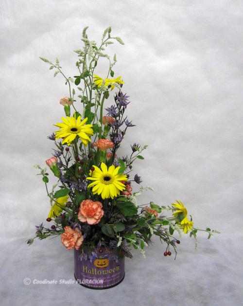 紫色の背景色に、オレンジ色のパンプキンのイラストと黄色い文字が入っている花器です。反対色ですね。黒と合わせるよりも、ロマンティックな感じがしませんか?大人のハロウィンナイトのイメージです。花器のイメージから、花材を合わせてみるのもいいですね。