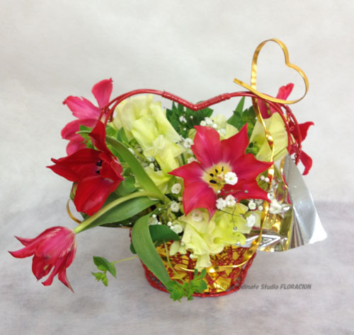 今年は、雪のバレンタインデーになりそうです。当日を迎え、今年最後のバレンタインアレンジメントをご紹介します。赤い可愛いワイヤーバスケットに、春のお花を詰め込んた受講生作品です。実際に、誰かに贈ったものではなく、女の子のお部屋のインテリア用です。