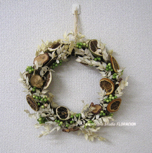 自分で作るのは結構難しいドライフラワーですが、ステキな花材が多数市販されています。輸入品も多く、日本では見られない珍しいお花に出会うこともありますよ。このリースも、市販品を使っています。ビタミンカラーだったオレンジやレモンは、ニュアンスのある土色に変わりました。リンゴのスライスも、ジャガイモみたいになっていますが、フルーツケーキなどを連想するからでしょうか?やっぱり皆んな美味しそう!暗くなり過ぎないようない、生成りの葉っぱをたっぷり使って、キレイに枯れた感じを出しました。みずみずしい色も欲しいので、グリーンの実もの(造花)も合わせています。