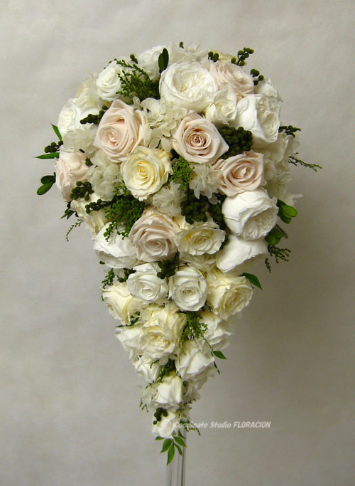 チャペルのウエディングでは、白いウエディングドレスに白いブーケを持つのが定番ですが、ドレスやブーケのデザインや白の表情によって、印象が大きく変わります。こちらは、花嫁さんが、プリザーブドフラワーで手作りされたブーケです。新しくオープンしたゲストハウスで、ゲストと距離の近いカジュアルな挙式・披露宴を希望されました。花嫁さんのパーソナルカラーはスプリングなので、ドレスはオフホワイトのシンプルなAラインを選びました。ブーケは、小柄な彼女が持つとバランスがいいように、ティアドロップを合わせました。