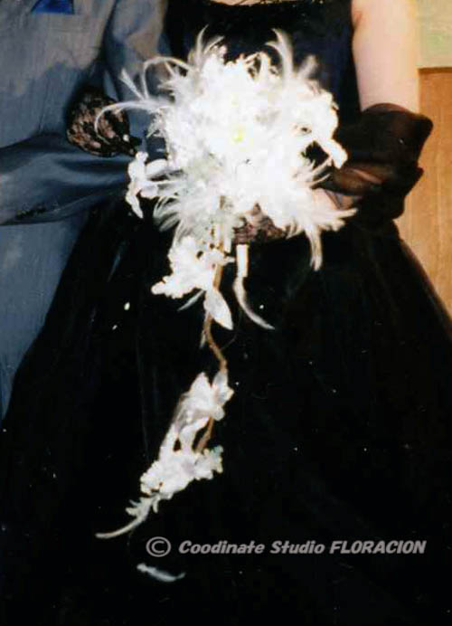 メインのお花は、シルクフラワーのカトレアです。花嫁さんの大好きな白いフェザーを一杯入れて、シンプルな配色が、とても華やかに仕上がりました。