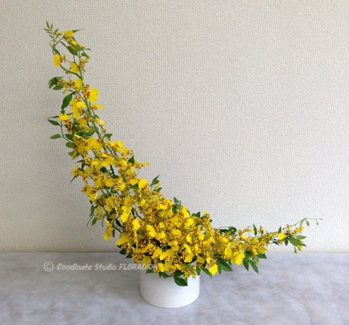 この黄色いお花は、オンシジウムという蘭の仲間です。原種だけでも500種ぐらいあって、交配種ともなれば、相当な品種があるそうです。ピンク系やオレンジの花もありますが、フラワーショップで出会うのは、黄色いお花が多いですね。その黄色も、レモンイエローもあれば、このようなタマゴ色も様々あります。色のトーンだけでなく、お花の模様も様々で、この花のように、茶色い模様が入ると、タマゴ色が落ち着いて見えます。