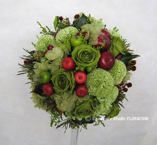 このブーケ、りんご以外は、プリザーブドフラワーを使用しています。抹茶グリーンのバラは実際にはありませんが、ピンポンマムやアジサイ、他の葉物は生花にもありますので、一見ナチュラルにも見える作品です。りんごはアーティフィシャルですが、結構リアルな色をしていますね。似合うドレスの形は、Aラインなどシンプル系で、色は、白か赤、ダークグリーンにも!