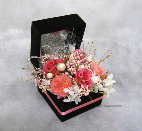 この作品は、受講生の方が、お世話になっているセレブな女性の誕生日に贈られたものです。華やかで、キラキラした人をイメージして、作られました。プリザーブドフラワーのバラとスプレーマム、ライスフラワーは、ピンクの濃淡を使って、エレガントな女性らしさを表現しています。白いアジサイと、ベビーファイバーという繊維で、フワフワさせました。