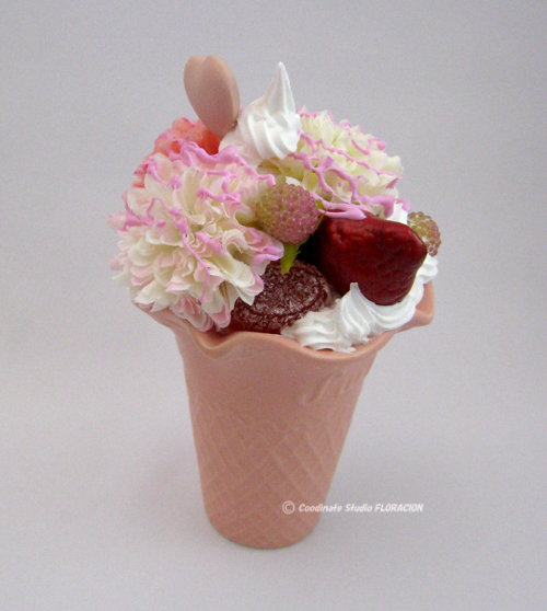 数年前、スィーツブームの影響で、フラワーアレンジメントでパフェみたいな作品など作るのが流行りました。それにともなって、ソフトクリームのコーンカップみたいな花器や、生クリームみたいなソフトクレイまで発売されて、どんどんリアルになっていきました。現在、ブームは落ち着きましたが、時々楽しむ感じで、今でも人気があります。