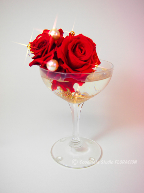 「乾杯」のイメージは、何色ですか?ワタシは、赤を思い浮かべました。赤はハレの色、お祝いの席に似合うおめでたい色という連想から、「乾杯!」をテーマにしたこの作品のメインカラーに赤を選びました。真っ赤なプリザーブドフラワーのバラは、とても存在感がありますが、いつもとは違うハレの非日常感が欲しくて、もう1色プラスしたくなりました。その色は、ゴールド!金色もハレの席にふさわしい色ですね。光物は、富の象徴ともいわれています。
