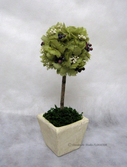 春にはピンク、夏には青いお花、秋には赤い木の実などイメージする人が多いのですが、冬らしいトピアリーって何色を思い浮かべますか?冬の初めに少し木の実が残って、ちょっと雪が積もったエバーグリーンなんていかがでしょう。グリーンはアジサイ、紫の実はペッパーベリー、白はライスフラワーです。受講生のプリザーブドフラワー作品ですが、なかなか小粋に仕上がりました。