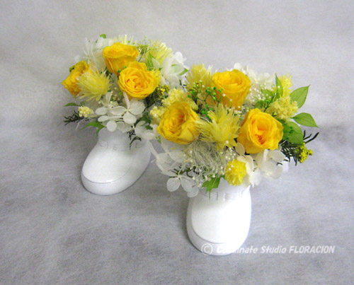 フラワーアレンジメントをご出産のお祝いに贈る場合、やはり男の子には水色、女の子にはピンク系を選ぶ人が多いのですが、タマゴやひよこを連想させる可愛い黄色もオススメですよ。まだどちらかわからない場合にも便利ですが、黄色は元気が出る色なので妊婦さんを応援することも出来ます!この作品は、ベビーシューズの形をした花器に、プリザーブドフラワーのミニバラ、デイジー、ライスフラワーなど黄色の濃淡で仕上げたトリオ配色です。赤ちゃんのフワフワした感じがする可愛い作品になりました♪