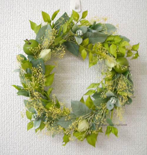 昨日、萌黄色についてお話ししましたので、今日は、萌黄色を使った受講生作品をご紹介しましょう。プリザーブドフラワーとシルクフラワー(造花)をミックスして作ったリースです。萌黄色をしているのは、プリザのルスカスという葉っぱです。この色が多めに使われているので、春の訪れを感じます。