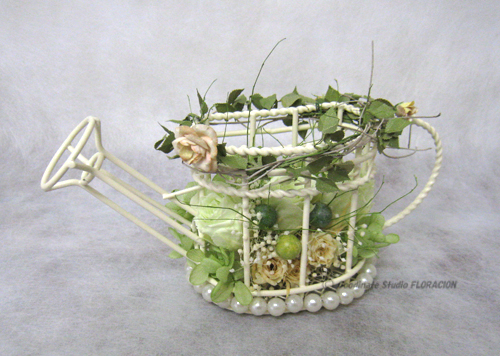 プリザーブドフラワー用に、このような可愛いジョウロ型のフラワーベースが、発売されています。この作品は、受講生のかたが、お友だちの新築祝いに贈られたものですが、イメージは春を待つガーデニング!新しいお家に似合いますね。ガーデニングから連想する色は、グリーンという人が多いのではないでしょうか?