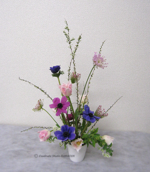 お野菜と一緒で、お花もハウス栽培が進化して、一年中手に入るものが多くなっています。でも、やっぱり植物は、本来の季節の旬物が元気で、お値段もリーズナブルですね。このアレンジメントに使われている花材は、春以外の季節には、あまり出回っていません。ピンクレースフラワーは、周年見かけますが、チューリップ、アネモネ、コデマリ、雪柳は、早春を中心に活躍する花材です。