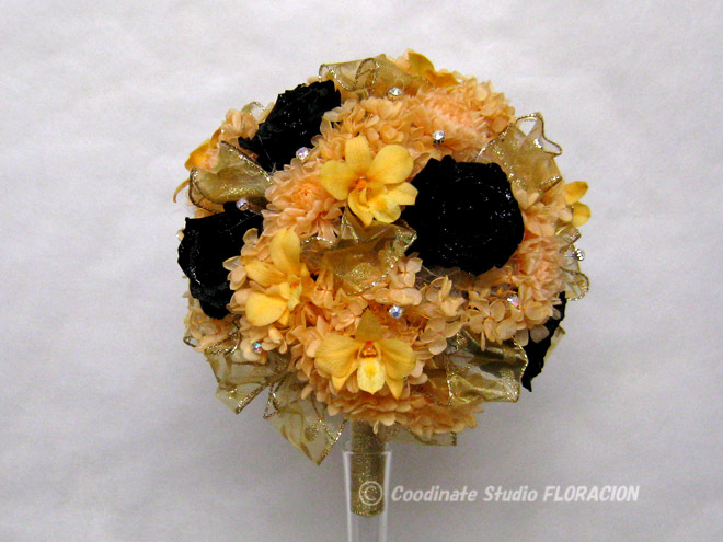 このブーケは、オレンジ色に黒いレエスが入ったドレスでお色直しをされた妹さんのために、お姉さんが手作りして贈ったブーケです。この場合、黒いバラは主役ではありますが、花色ハーモニーメソッドでは、黒は花色ニュートラルカラーだと考えて、他の色に注目してみましょう。脇役は、ビビッドな黄みのオレンジ色のデンファレという蘭のお花です。形が、蝶のようで可愛いですね。そこへ、色相がとてもよく似たオレンジ色のアジサイを合わせて、ゴールドのリボンをたっぷりプラスしています。ゴールドの色みは様々ですが、このリボンのゴールドは、色相でいうと、黄色です。オレンジ色と黄色も、色相がお隣どおしの類似色です。