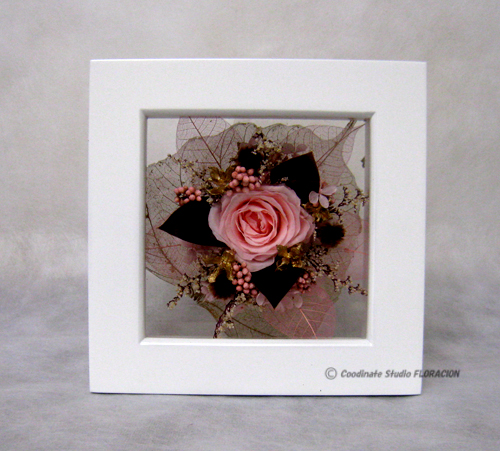 この作品は、私がご年配のご夫婦に贈ったものです。奥様は、お花の大好きな、華やかで上品な方です。可愛くなり過ぎないように、プリザーブドフラワーのピンクのバラに、ワインレッドの葉っぱと、ゴールドを合わせて、奥様好みにしました。このフレームは、壁にもかけられますが、置いて飾ることもできるタイプです。